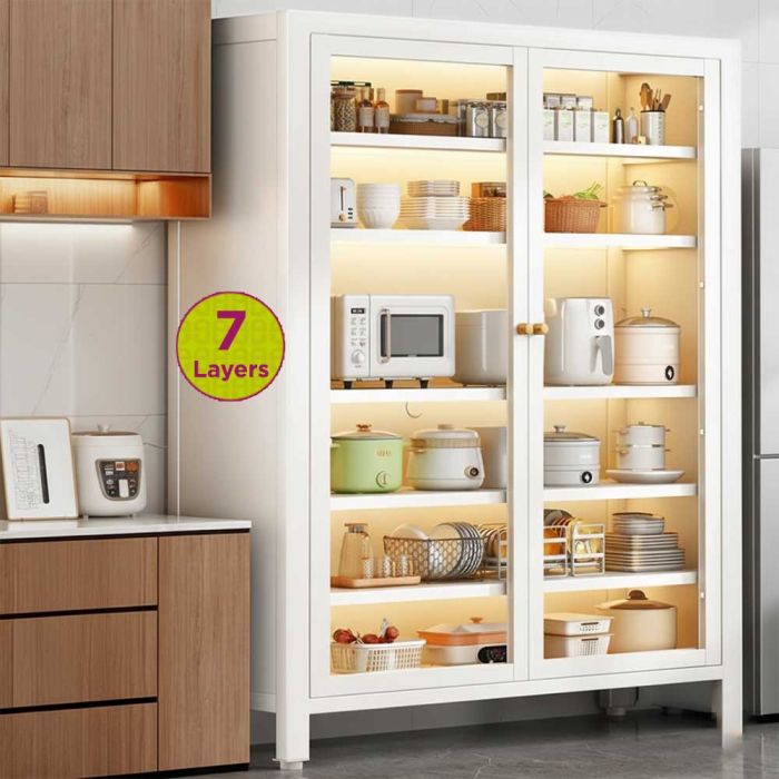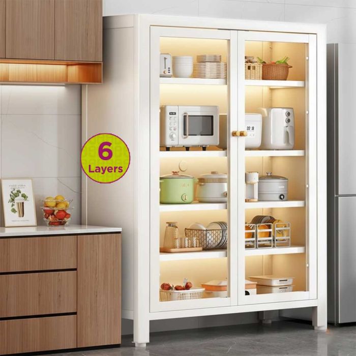 This multi purpose metal kitchen cabinet with doors is made of a durable carbon steel structure, featuring a closed design with tight doors that help protect contents from dust, offering organized storage spaces for kitchen appliances and essentials in a neat elegant way
