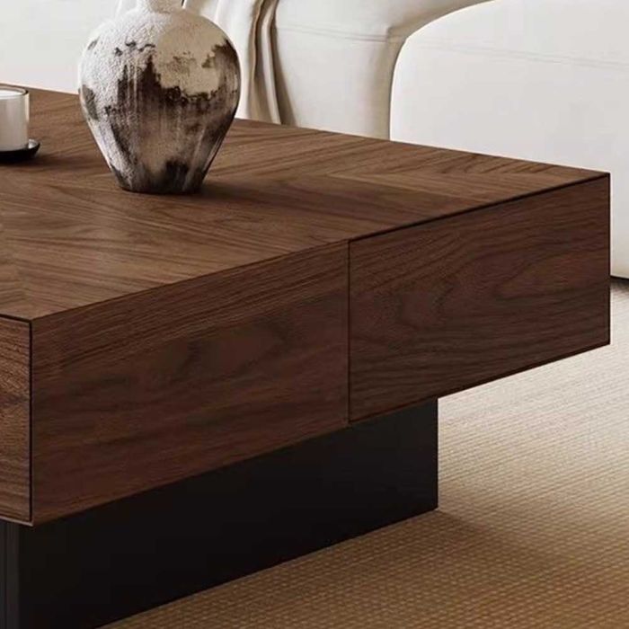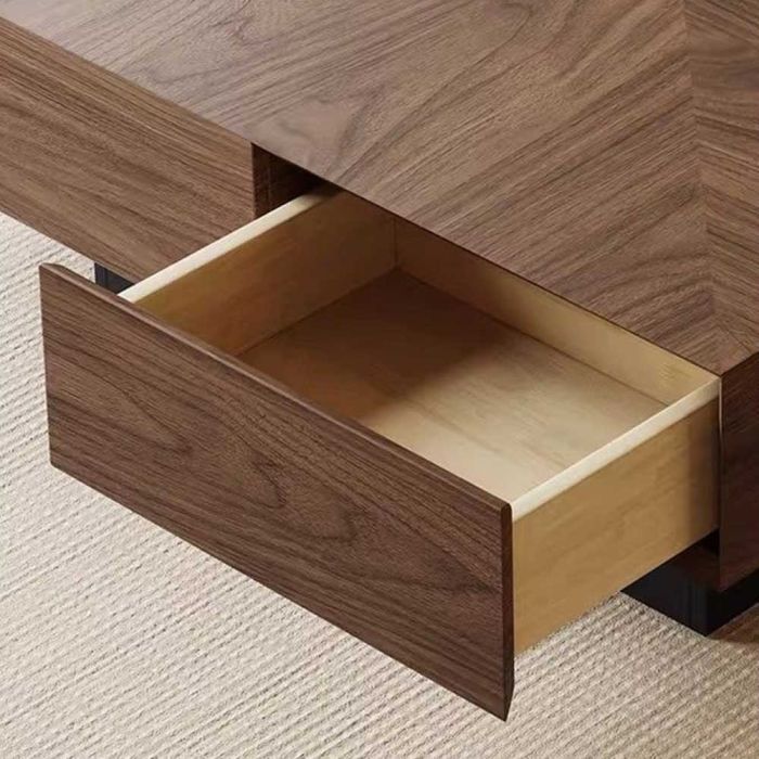 This Set 2 Tables with 4 Drawers is made of walnut wood top, pine wood drawers, a black baked-paint base, 4 drawers with quiet sliding, an inner rim to prevent items from falling, and flexible styling for your living room.