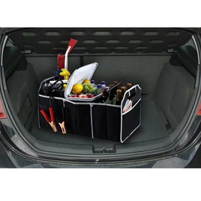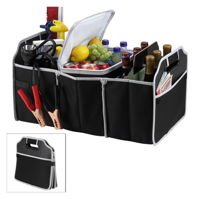 Storage Solutions Collapsible EZ Trunk Organizer and Isolate The perfect companion for road trips, picnics, office trips, school and more! Fully collapsible and portable and folds completely flat for storage. Three section collapsible trunk organizer with removable insulated . Leak proof thermal shield insulated keeps food and drinks at the perfect temperature. Includes a mesh pocket. Holds and organizes everything you need for your day. Keep your trunk of your vehicle neat and clean.