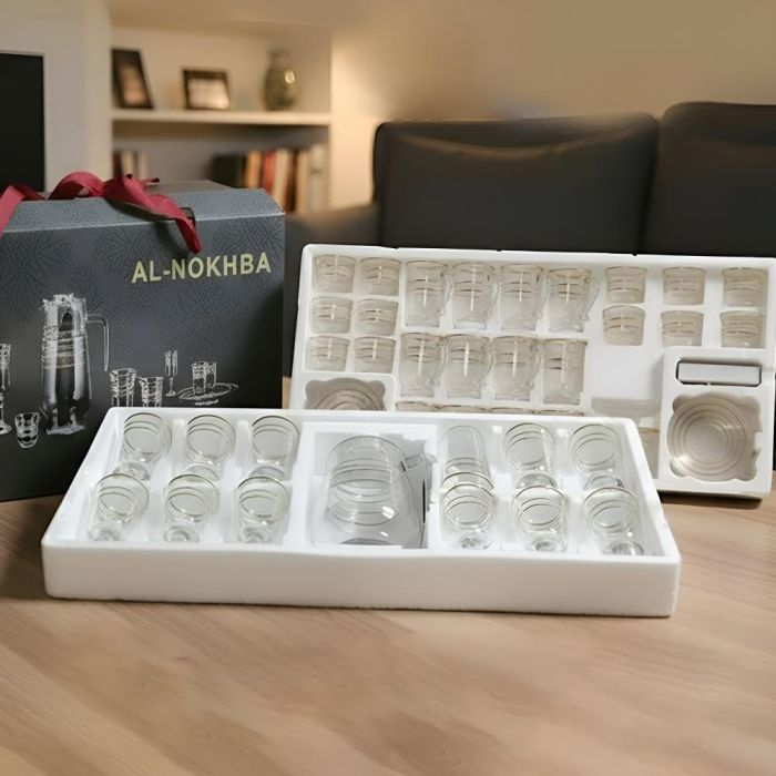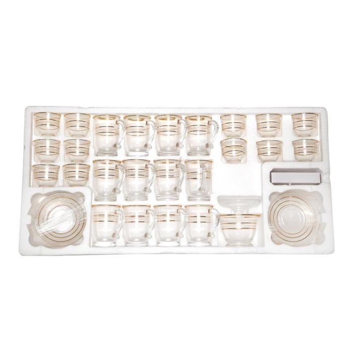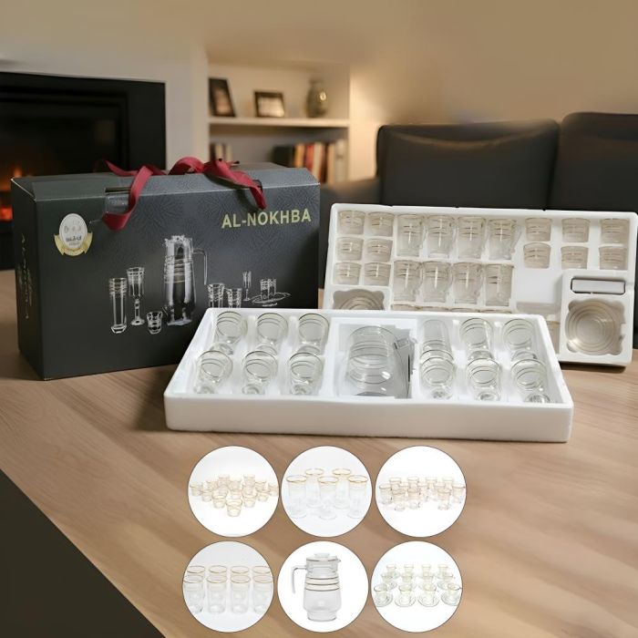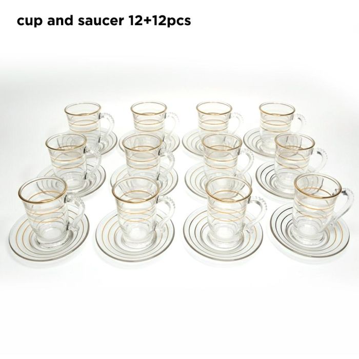 - Set Contents: 12 Arabic Coffee Cups + 12 Tea Cups + 12 Saucers + 12 Spoons + 12 Water Cups + 2 Sugar Cups + 1 Pot with Lid