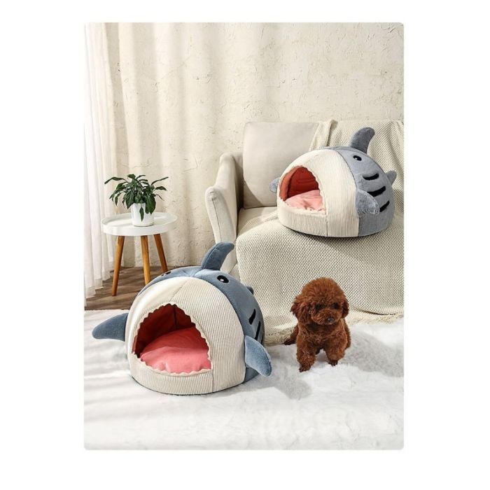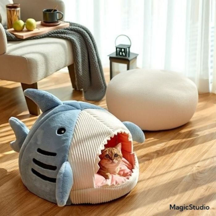 This Shark Design Enclosed Cat House for Winter made of soft materials, provides a safe and cozy space for cats, enclosed structure helps retain warmth, cushioned interior for extra comfort, ideal for indoor use