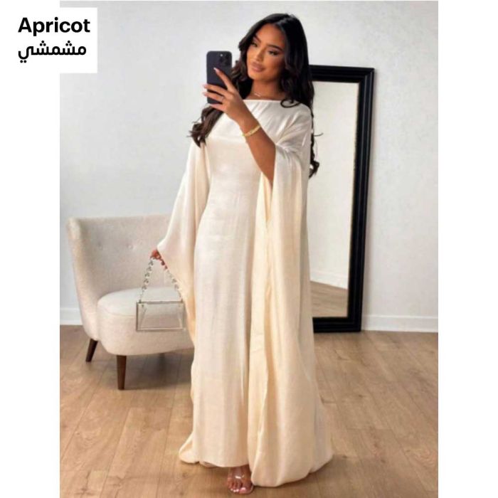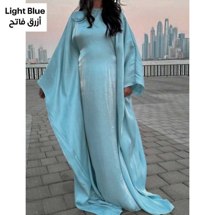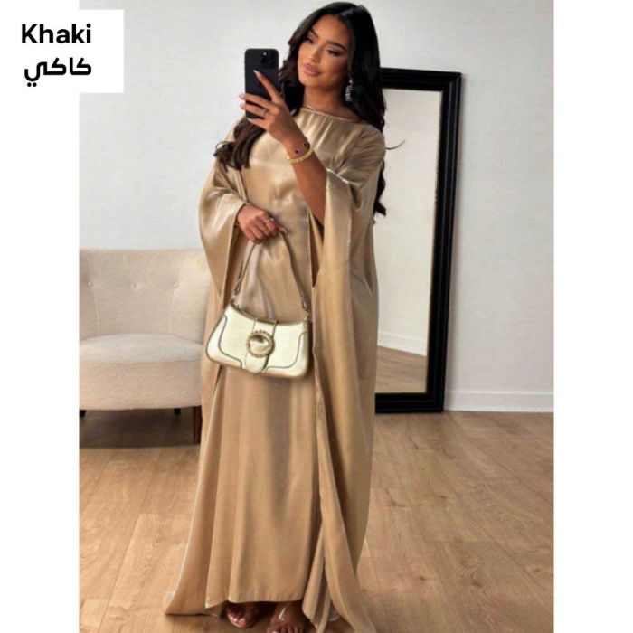 This Shiny Wide-Sleeve Dress for Women made of smooth polyester, featuring a flowing elegant silhouette that adds a refined shine, creating a feminine balanced look suitable for special occasions and elegant outings