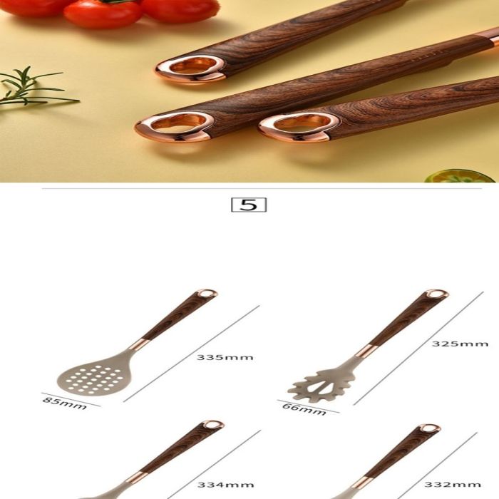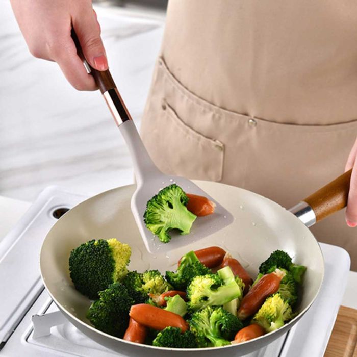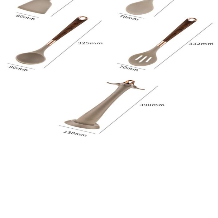 This silicone and wood kitchen utensil set with stand combines elegance and durability to upgrade your cooking experience. Heat-resistant silicone heads protect your non-stick cookware from scratches, while the wooden handles provide a comfortable grip and stylish finish. The included stand keeps your utensils organized and accessible, making your kitchen look tidy and modern. Easy to clean and long-lasting, this set is perfect for everyday cooking and serving.