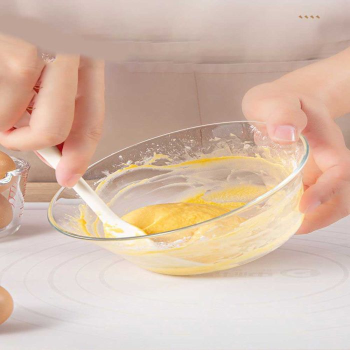 This three-piece silicone baking tool scraper set gives you precise control in mixing dough and scraping bowls, made of safe and flexible silicone that ensures even distribution of ingredients, ergonomic grip reduces strain, easy to clean after use, and adds a professional touch to baked goods and desserts with consistent performance that lasts over time.