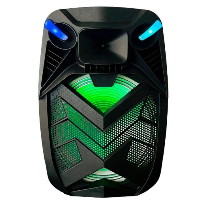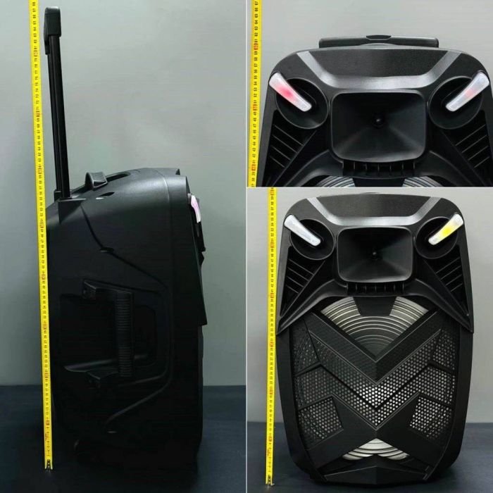 RGB lights synchronized with the music, TWS mode for connecting two speakers. Wired and wireless microphones for karaoke. Bluetooth, AUX, USB, TF, FM inputs, and a 5000mAh battery for long playtime. Suitable for parties, home, and outdoor trips.
