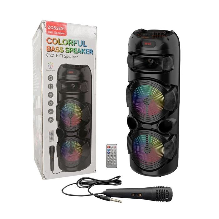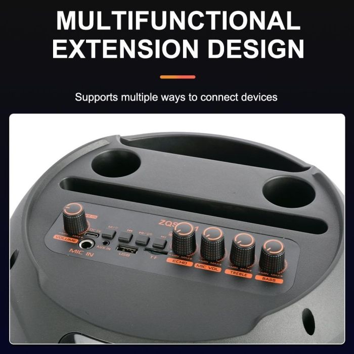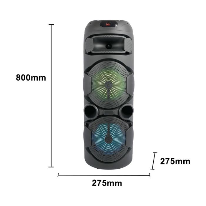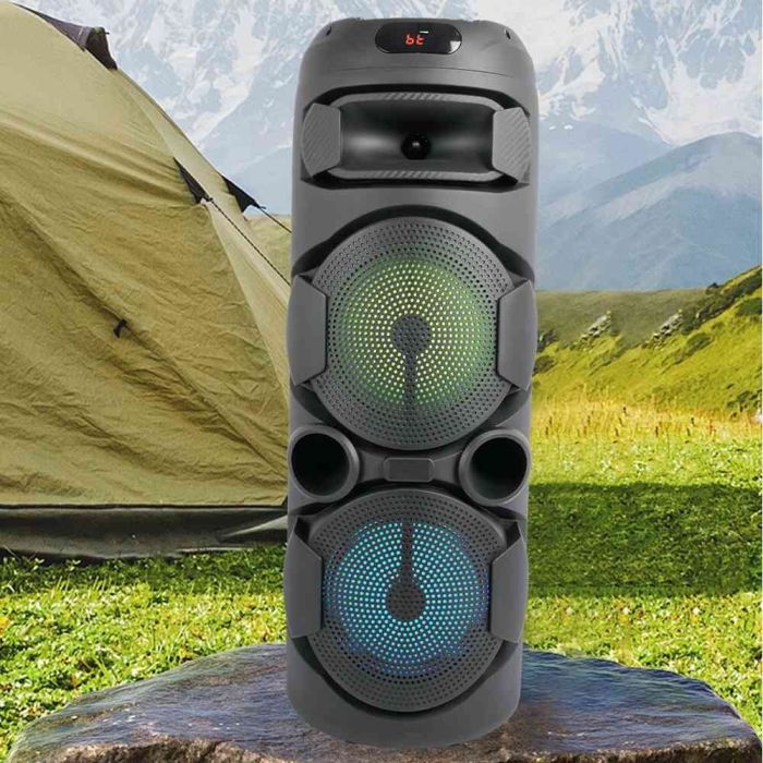 Vibrant RGB lighting. Supports Bluetooth, USB, TF, FM, AUX, and wired microphone. 3600mAh battery for 5–10 hours. Dual speakers for deep, rich sound, perfect for house parties, travel, and events.