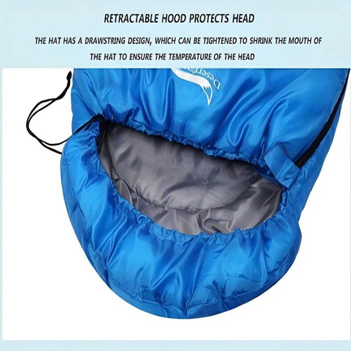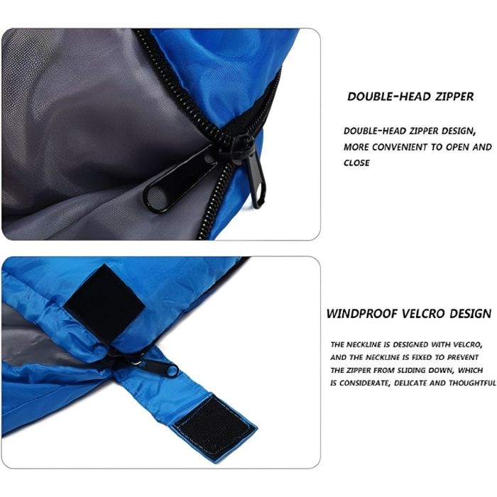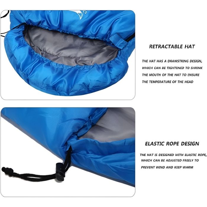 Adventure doesn't stop when the weather turns, this sleeping bag has got you covered on your outdoor adventures. Designed for durability and ultimate comfort, Waterproof and equipped with double head zipper with a drawstring hat for easy temperature adjustment and get the required warmth, with a perfect individual size that provides enough space to relax and sleep soundly
