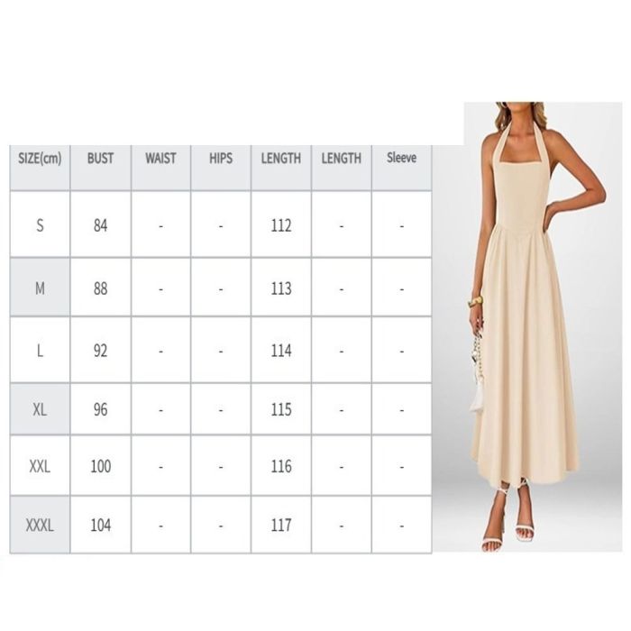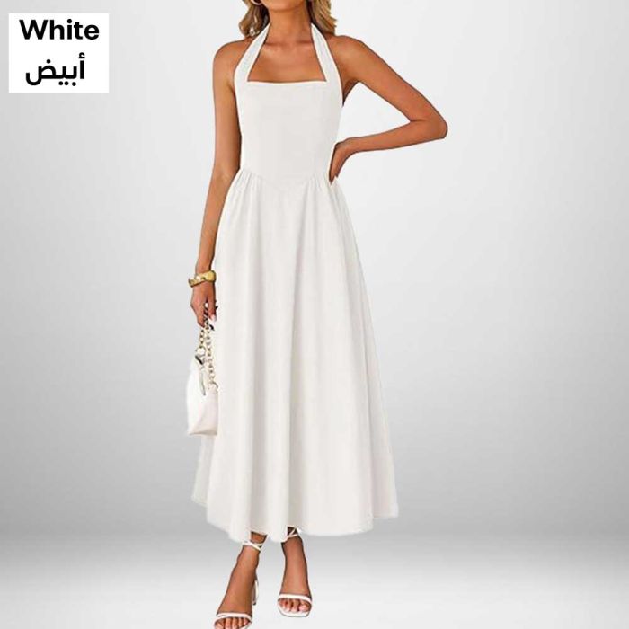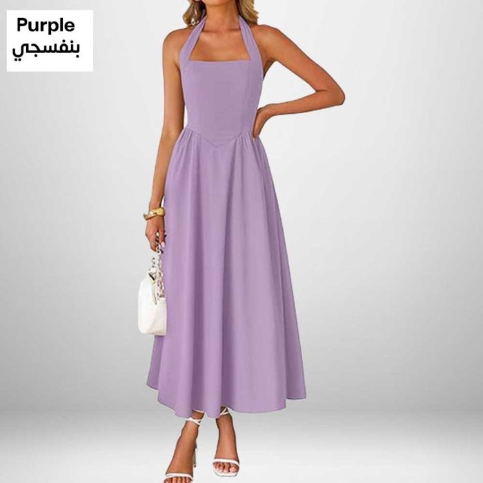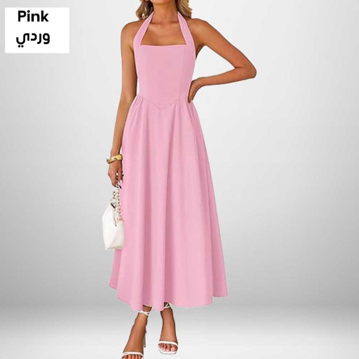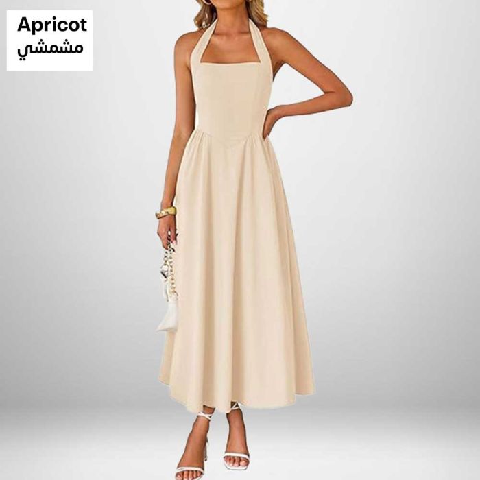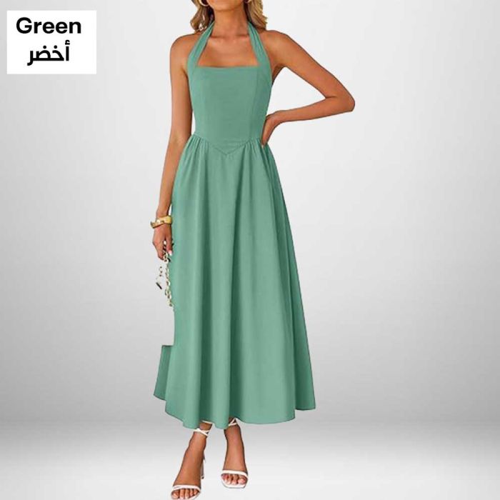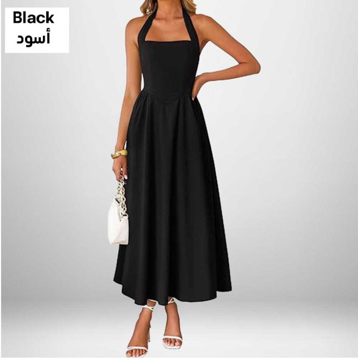 This Elegant Sleeveless Evening Dress for Women is Crafted from a Lightweight, Soft Fabric with a Halter Neck and Wide Shoulder Design. This Dress Features an Open Back, Adding a Touch of Femininity and Charm. It is Ideal for Summer Occasions and Evening Events, Providing an Elegant and Comfortable Look. It Also Maintains Its Quality and Highlights the Beauty of the Body in a Soft and Modern Way.