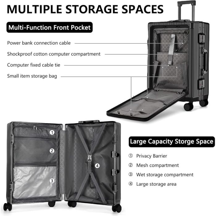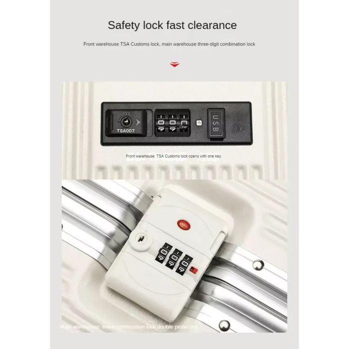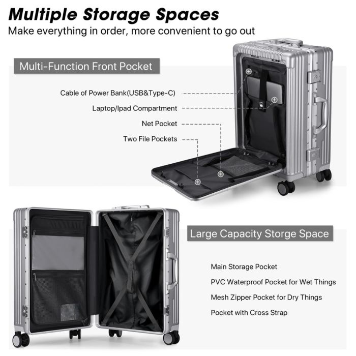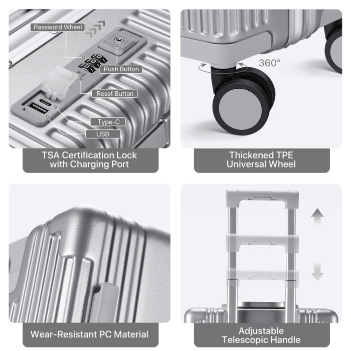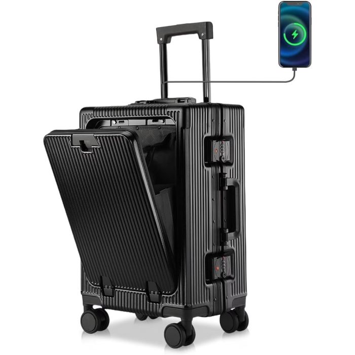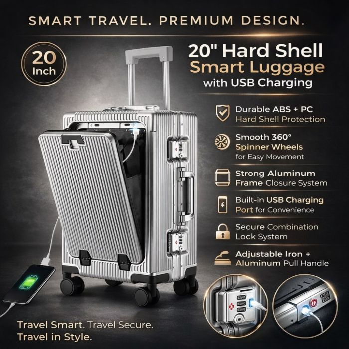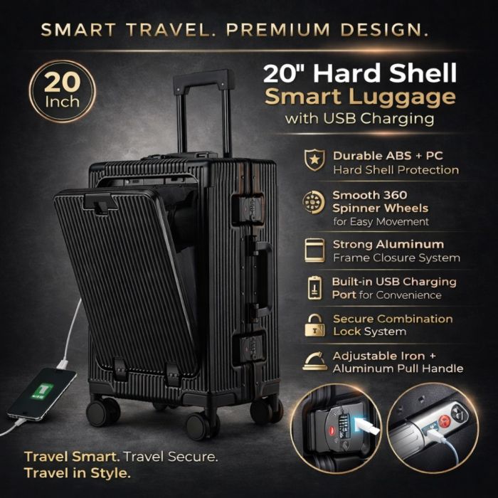This Smart travel luggage with dual lock system and USB & Type-C charging port 20 and 26 inch made with a durable hard shell design, provides high security with TSA lock and combination code, allows easy charging on the go, and offers quick access with smart internal organization that maintains its quality