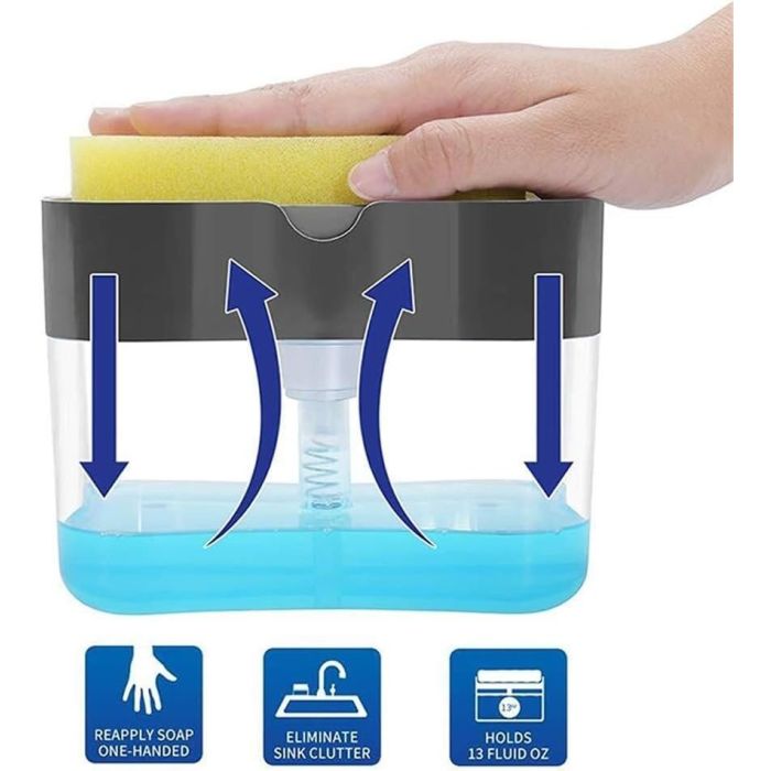 - Combines a soap pump dispenser with a sponge holder, saving space and preventing water accumulation on countertops