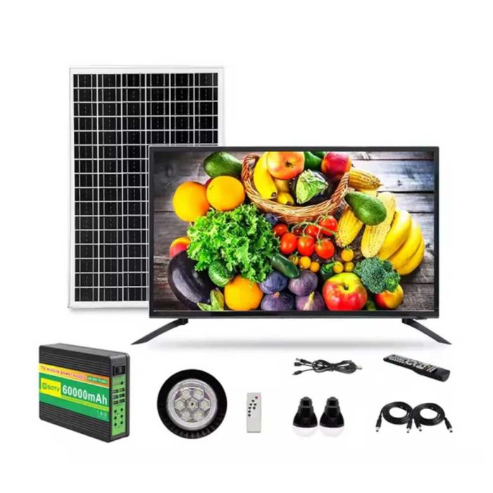 32 Inch Solar Powered HD TV with 50W Panel, 60000mAh Battery, 3 LED Bulbs and Remote