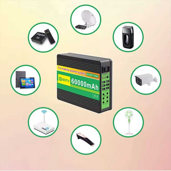 - Rechargeable battery with 60000mAh capacity and 12V and 5V outputs