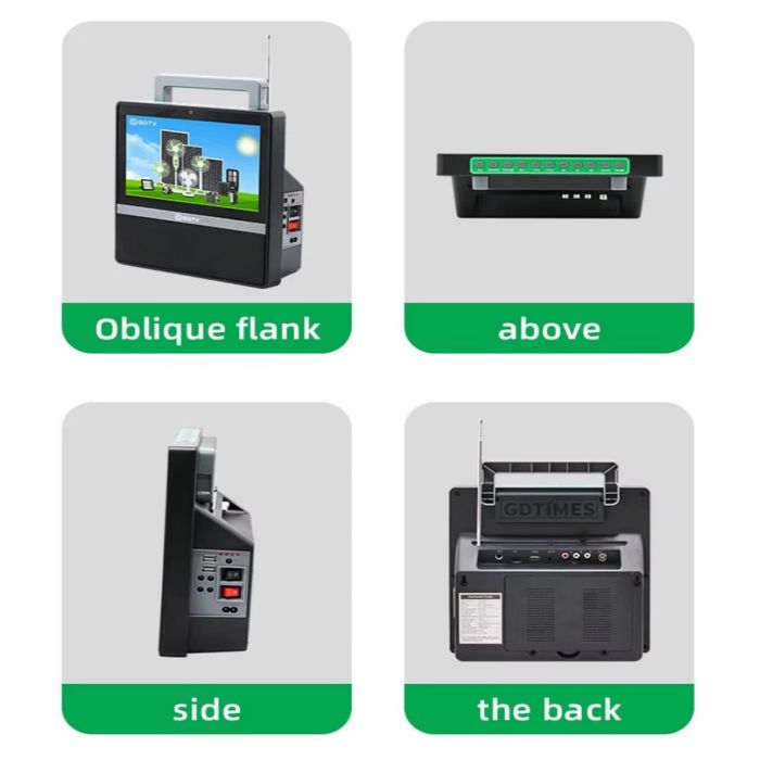 Stay powered and entertained anywhere with a 12V solar media system combining renewable energy, entertainment, and lighting in one portable unit. Equipped with a high-efficiency 20W solar panel and a 12V 7A battery, it delivers long-lasting, eco-friendly power for off-grid living, camping, and emergencies. The 10-inch screen provides clear visuals for video playback, while USB and SD support, FM radio, AV, and RF inputs ensure versatile media options.