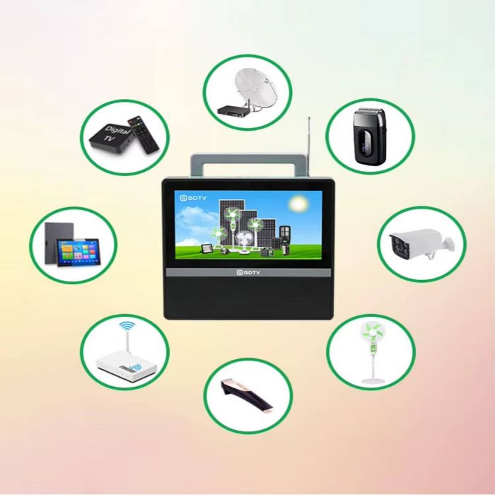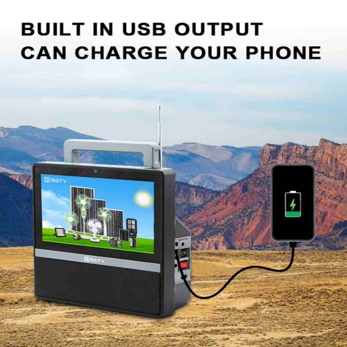 - Solar TV Media System 10-Inch with 20W Panel and Built-in Powerbank