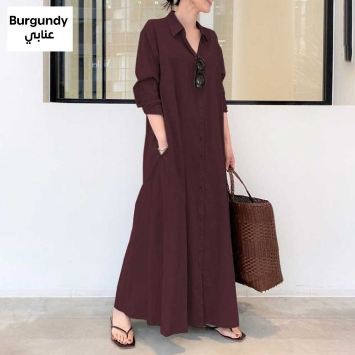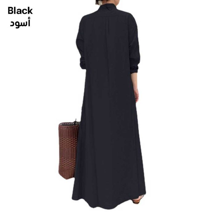 - Solid Color Collared Long-Sleeve Long Dress for Women