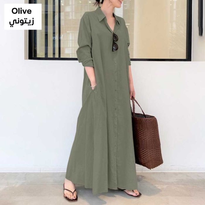- Long Loose Dress with Long Sleeves and an Elegant Collar