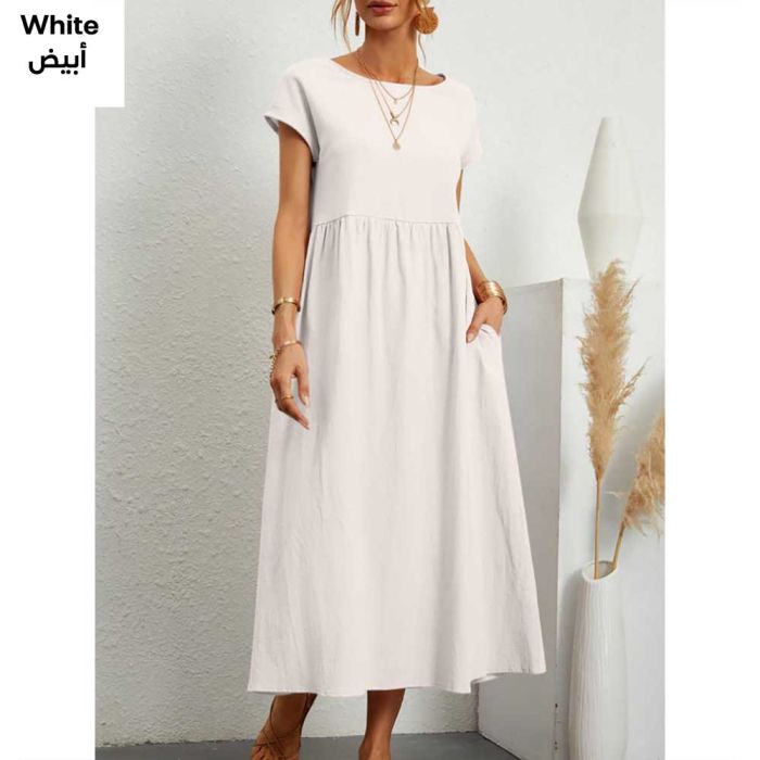 - Solid Color Sleeveless Loose Cotton Linen Pocket Long Dress - Small - White