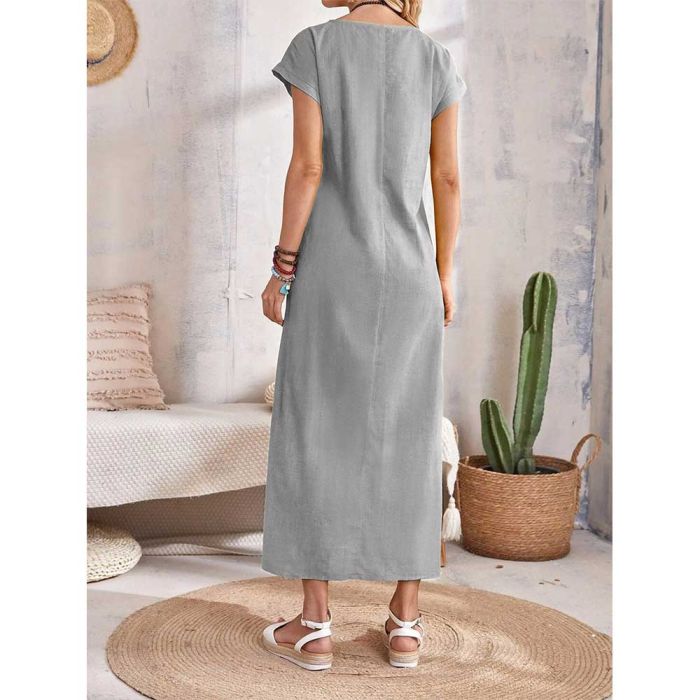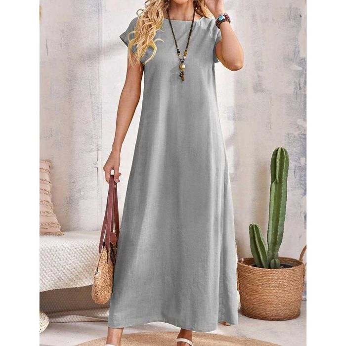 - Solid Long Dress with Short Sleeves and Round Neck For Women