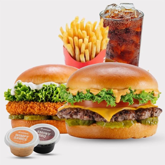 Enjoy a delicious meal including a beef burger, chicken burger, crispy fries, and a refreshing drink from Wimpy — a perfect choice for a quick and satisfying bite.