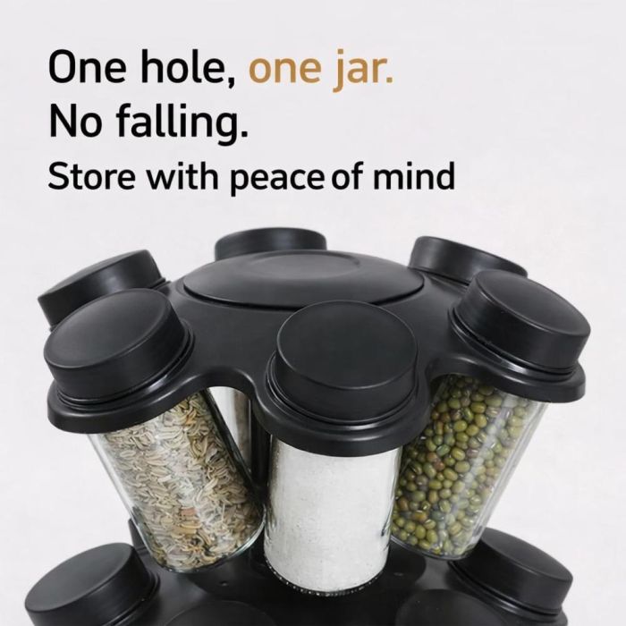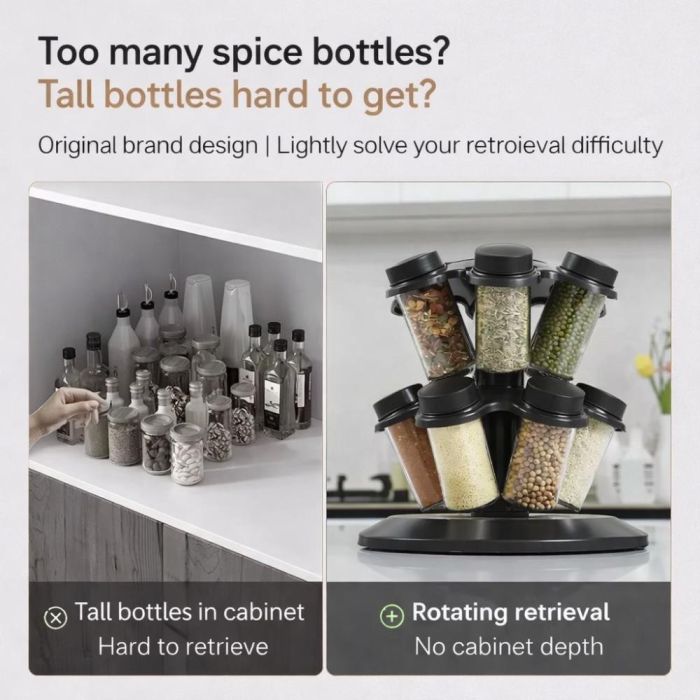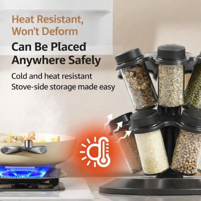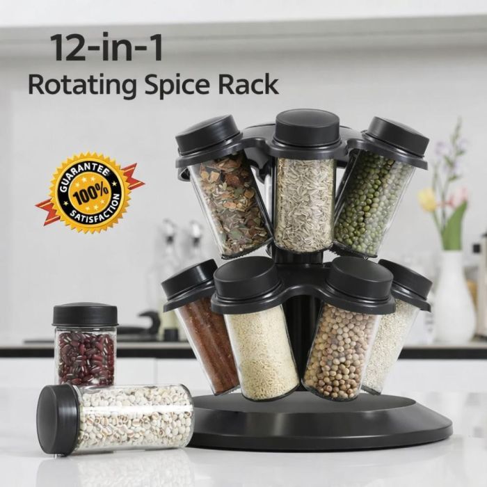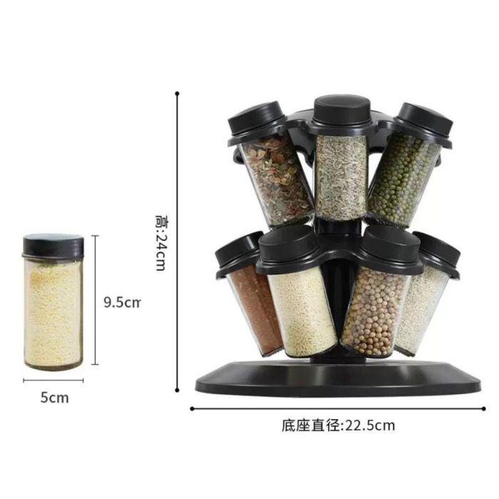 Organize your kitchen easily with this rotating spice rack featuring 12 jars and a removable lid, for neatly storing spices and quick access while cooking.