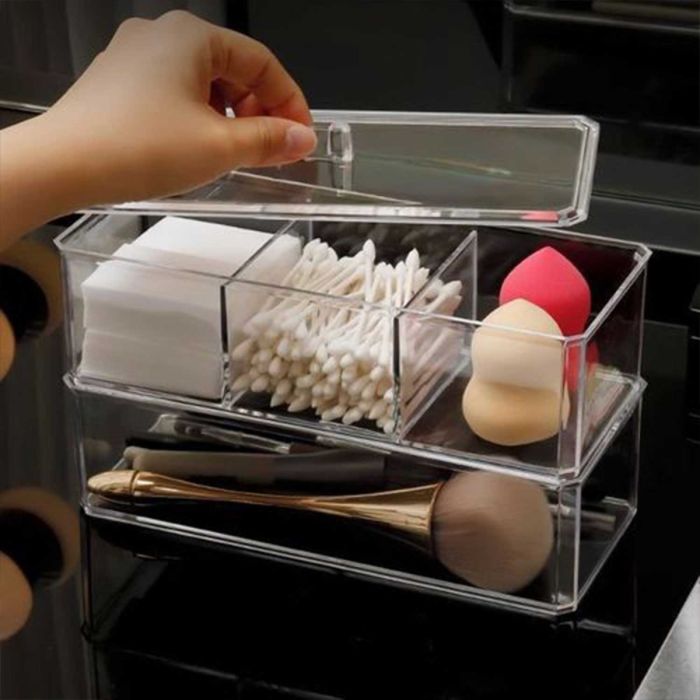 This transparent makeup organizer with lid provides an elegant way to keep your essentials tidy and clean. Its clear design allows you to easily view and access contents, while the lid protects items from dust and maintains them in excellent condition. Perfect for cosmetics, accessories, or small tools, it is lightweight, durable, and a modern addition to your daily routine.