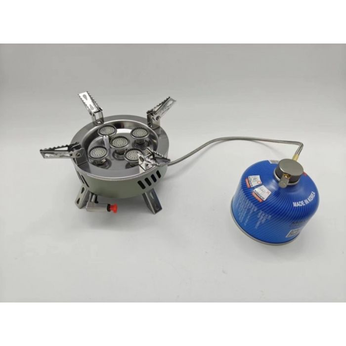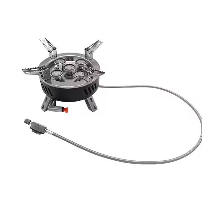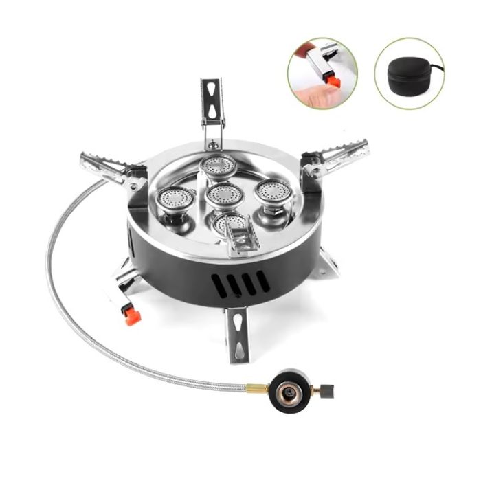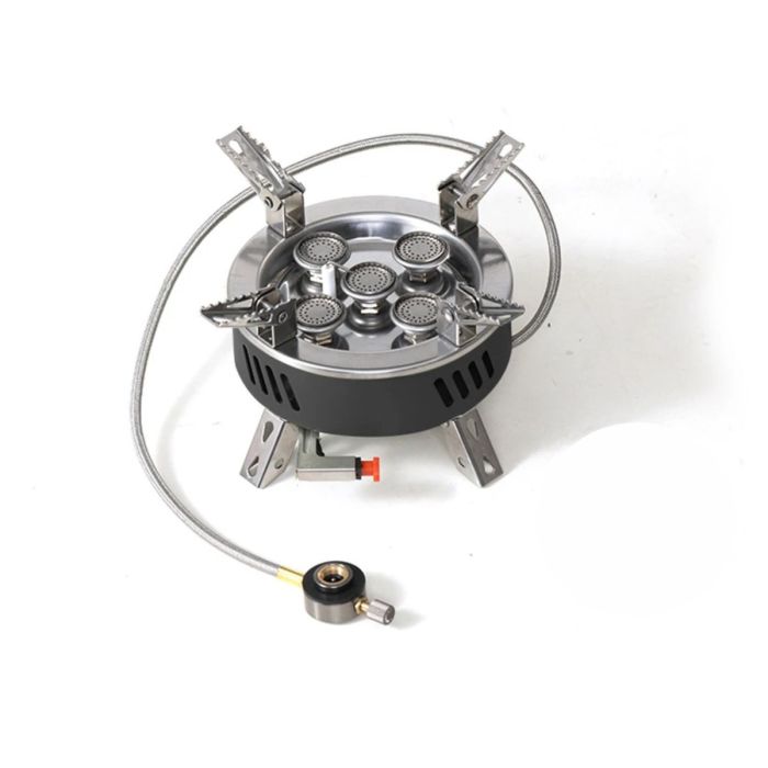 Enjoy a faster and more efficient cooking experience with this five-burner gas stove, designed for outdoor enthusiasts. Featuring a total output of 11,000 watts, this stove can cook meals for 3 to 5 people quickly and easily. Made of high-quality stainless steel and copper, it's built to last and withstand harsh outdoor conditions. Its wind-resistant design ensures a consistent flame, while its adjustable flame control and three fuel connection options make it versatile enough to meet a variety of camping needs. Its foldable frame and lightweight design come with a canvas storage bag, making it easy to carry on your adventures. Whether you're camping or hiking, this stove is your perfect outdoor cooking companion.