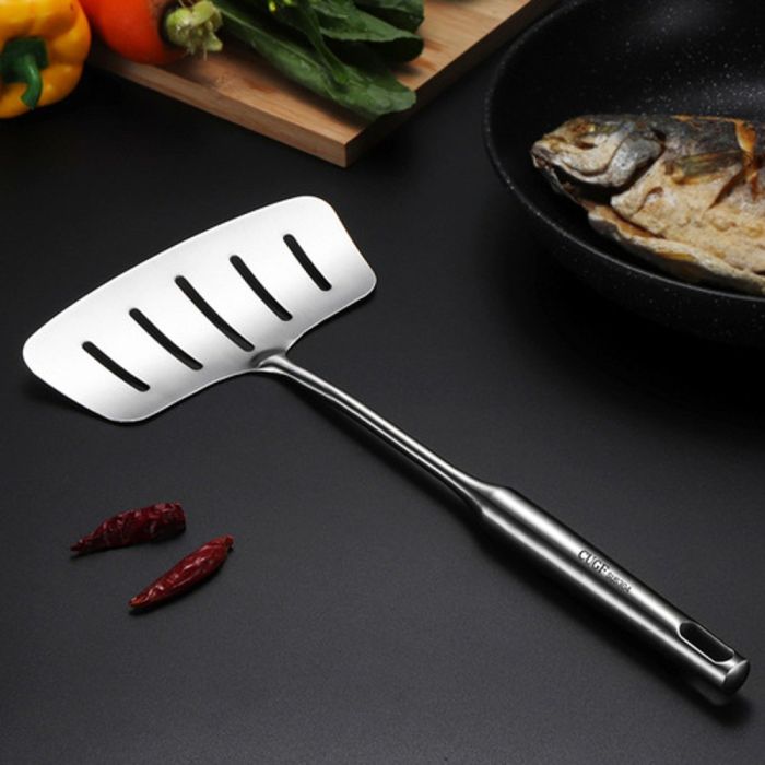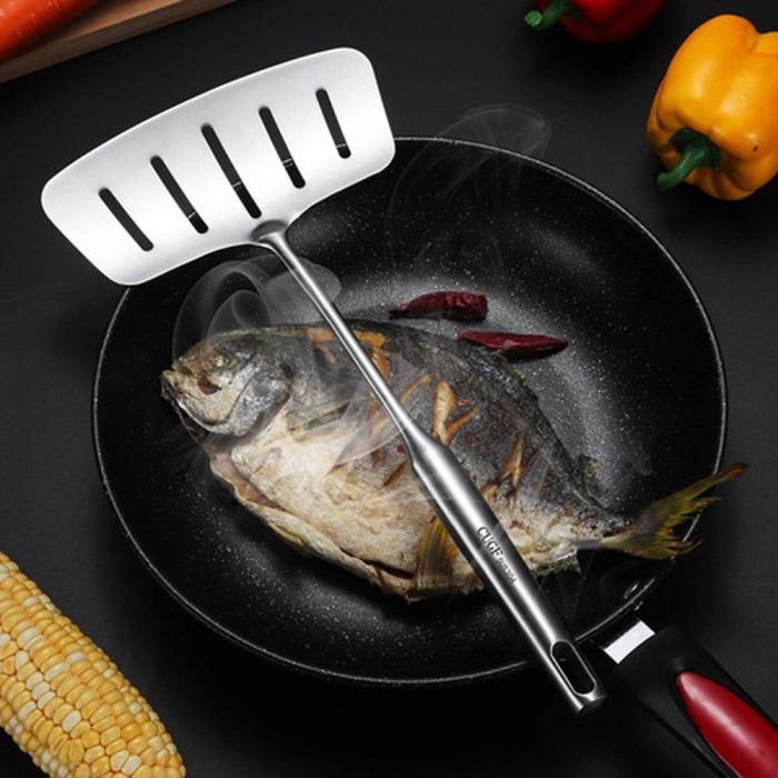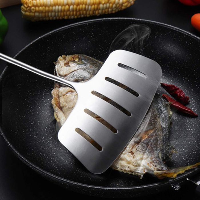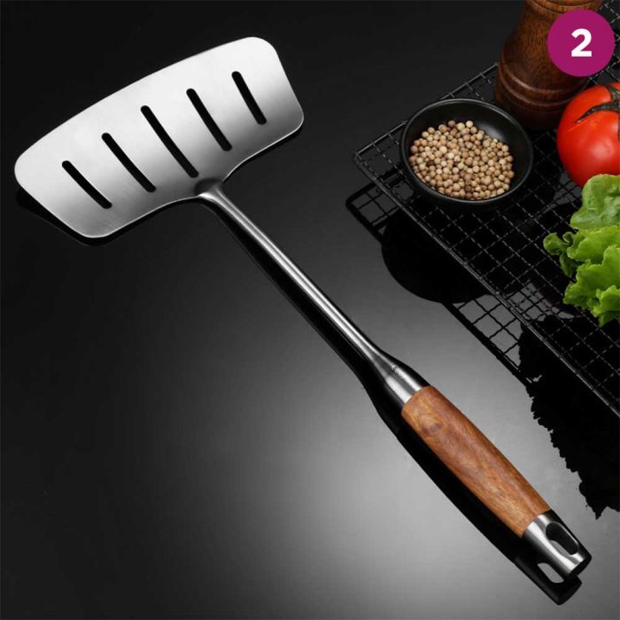 This stainless steel frying ladle is crafted from high-quality materials to ensure durability and strength, offering exceptional performance in the kitchen thanks to its elegant and comfortable design that facilitates cooking and maneuvering between dishes. It guarantees a smooth and efficient cooking experience due to its ability to withstand high temperatures without being affected or damaged, making it the perfect choice for every woman seeking practical and reliable kitchen tools.