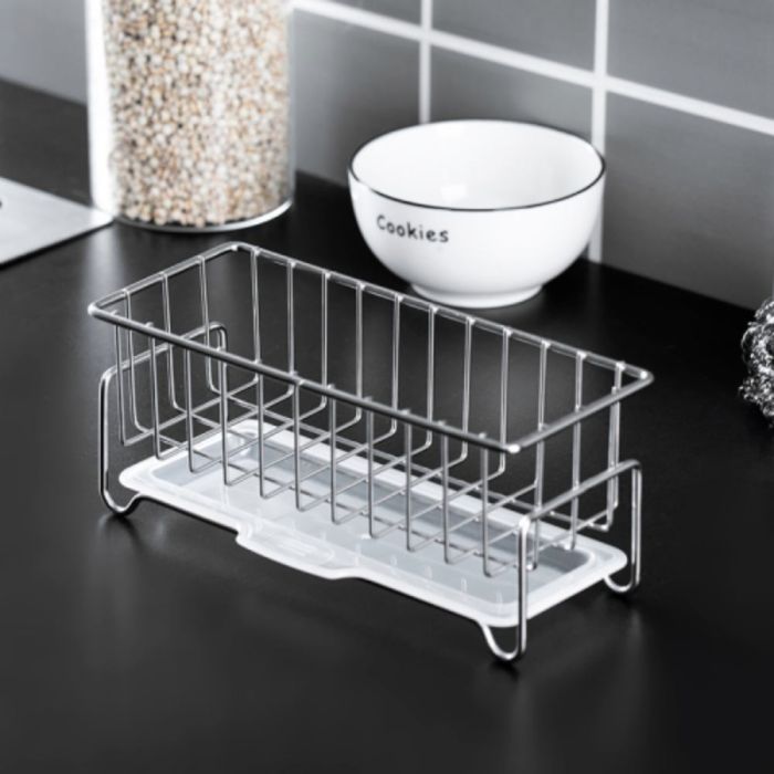 This Kitchen storage and drain rack made of 304 stainless steel, providing an organized space for sponges and dish soap with a bottom drip tray. Practical design keeps your sink area clean and adds a sleek touch to your kitchen.