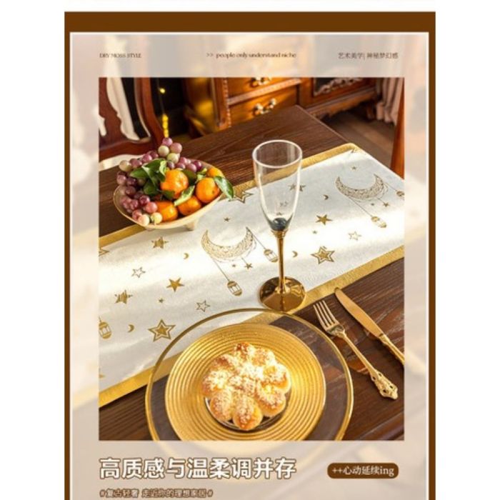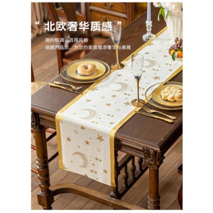 This Star design table runner made from soft polyester fibers, featuring elegant golden patterns and a luxurious touch, creates a warm festive atmosphere and gives the table a refined and harmonious look