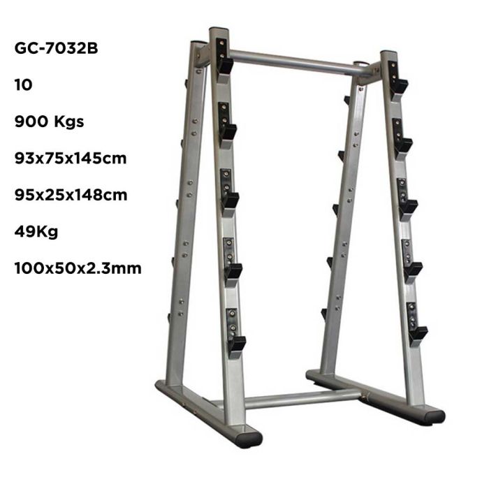 This steel barbell rack for 10 bars provides highly organized storage for training equipment, built with a durable 100×50×0.23 cm steel tube for strong stability. It supports up to 900 kg and features multi-level side holders that allow secure and convenient bar placement, making it ideal for professional gym environments.
