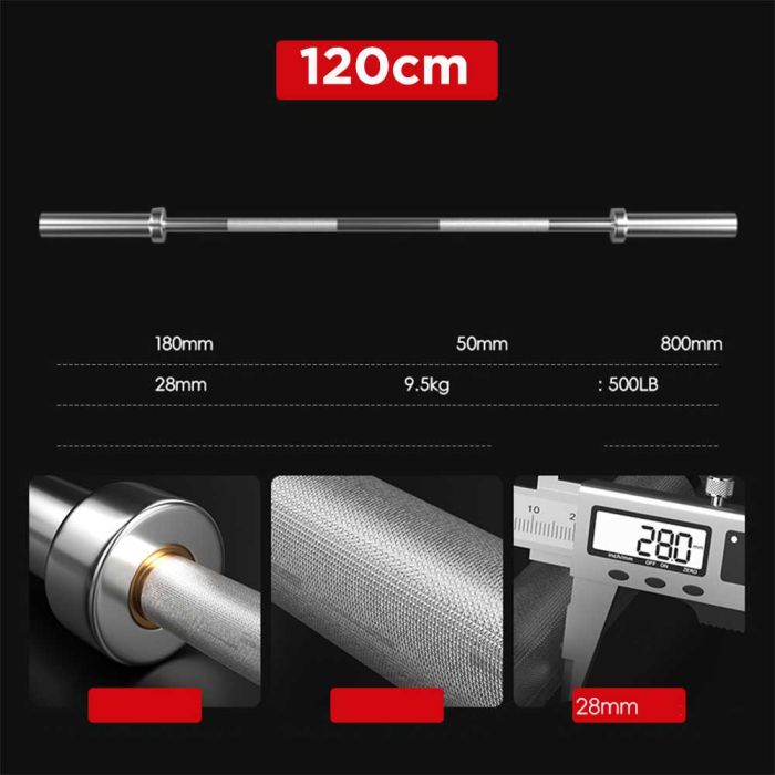 - 120 cm: 9.5 kg weight, 28 mm grip, 18 cm weight area, 227 kg capacity