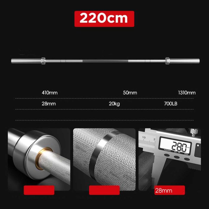 - 220 cm: 20 kg weight, 28 mm grip, 41 cm weight area, 318 kg capacity
