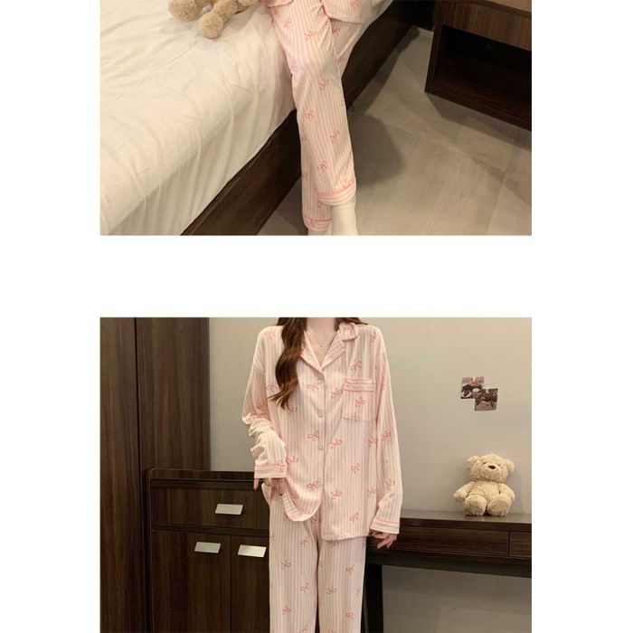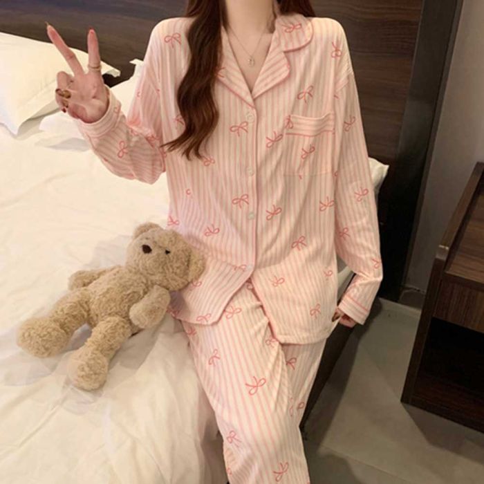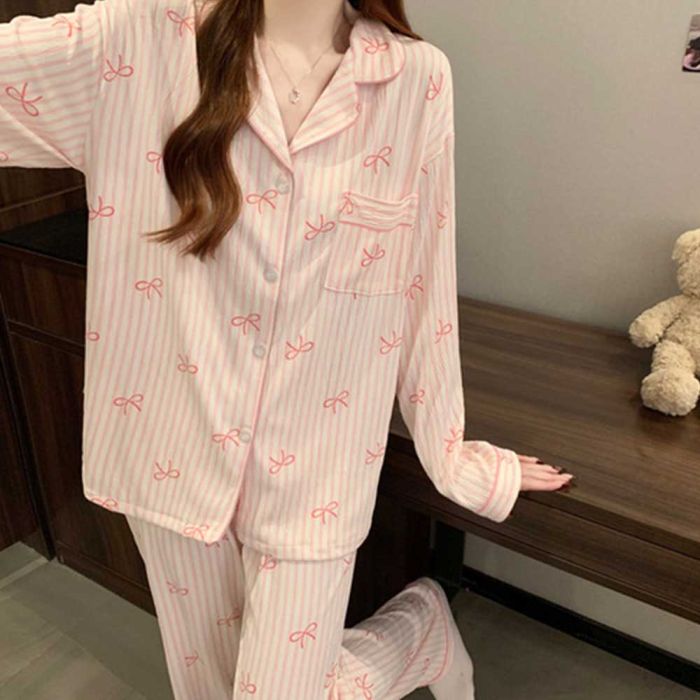 This Stylish Striped Pajamas for Women Made from Soft Cotton Fabric with a Modern Korean Design. Featuring Long Sleeves and Beautiful Striped Details, These Pajamas are Perfect for Casual Home Wear in Spring and Fall. Offering Superior Comfort and Suitable for Teens and Young Women, This Set Maintains Its Quality and Provides a Warm and Soft Feel, Making It Ideal for Stylish Lounging Around the House.