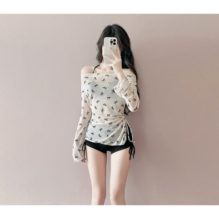 Exude effortless style with this attractive swimsuit set. The cover-up features long sleeves and a small bow print throughout, adding a touch of playful femininity. Adjustable side drawstrings ensure a comfortable and form-fitting fit. The set comes with comfortable shorts with matching drawstrings, giving you the perfect balance and appeal.Today’s Deal is Stylish Long Sleeve 3Pcs Swimsuit For Women