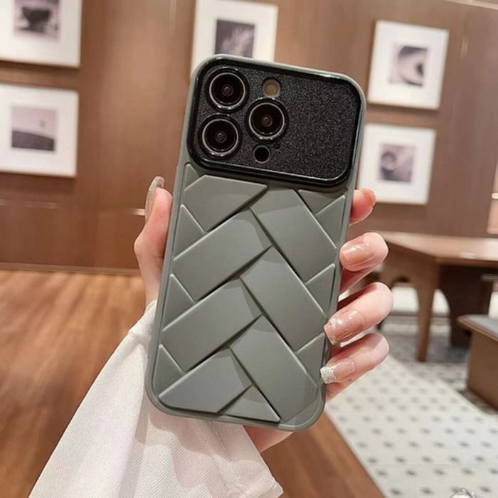 Elevate your iPhone with this stylish case. It features a subtly chic Silver Gray tone and a unique, raised woven pattern that provides both elegance and a secure grip. The contrasting black camera surround adds a sophisticated touch while ensuring lens protection. This understated yet eye-catching case is the perfect way to enhance your everyday style.