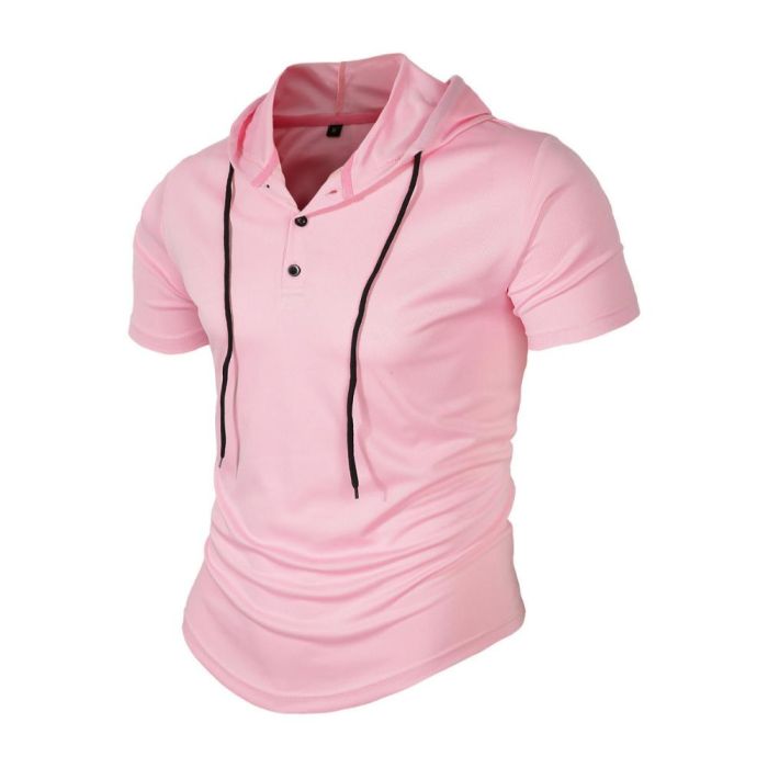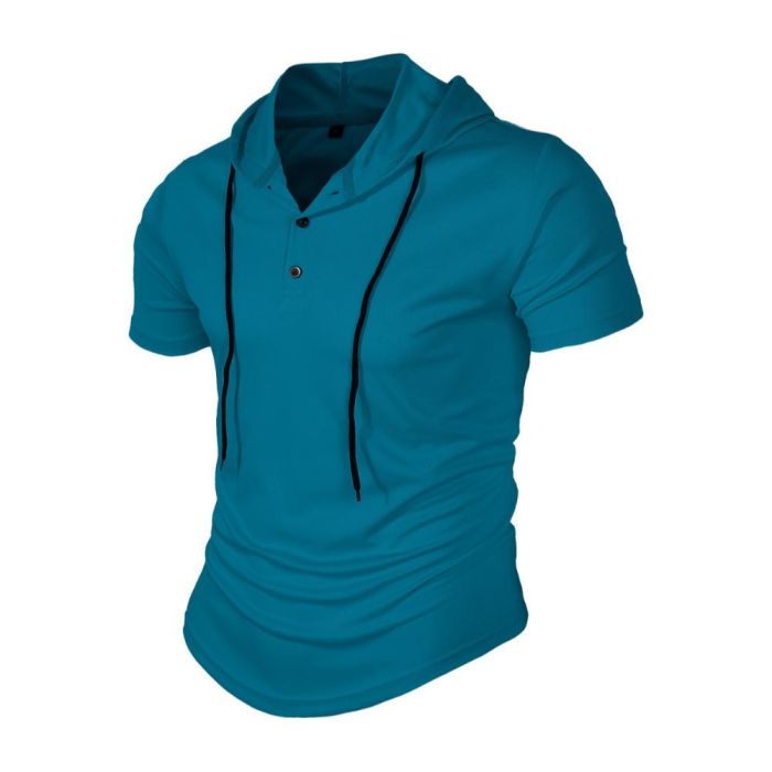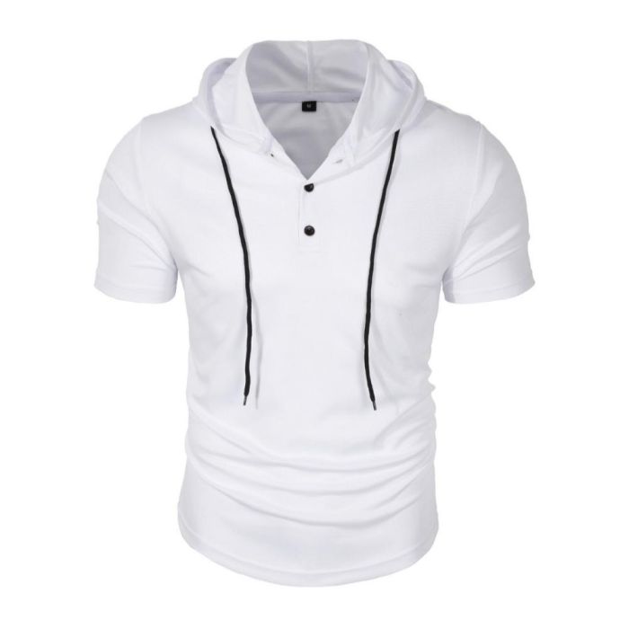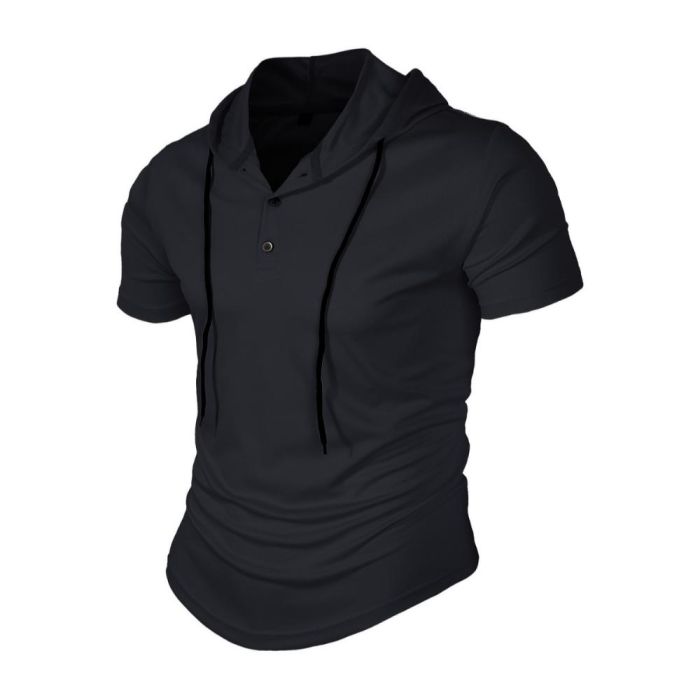 This Summer sports T-shirt with hood for men made from soft cotton fabric that offers excellent breathability, featuring a modern design that enhances both fitness and style, with front buttons adding a refined touch, perfect for workouts or casual daily wear.