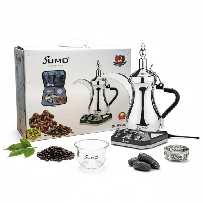Enjoy the easiest way to prepare authentic Arabic coffee with the Sumo electric coffee maker. Designed to make preparing the perfect hot coffee a breeze, all you have to do is add the ingredients and press the power button. The machine provides an audible and visual alert when the coffee is needed, and another when adding cardamom, ensuring a perfect taste every time. With a two-hour keep-warm function, your coffee stays hot and ready to serve. It has a capacity of 350 ml and a power of 800 watts.
