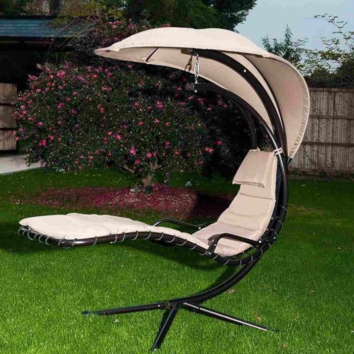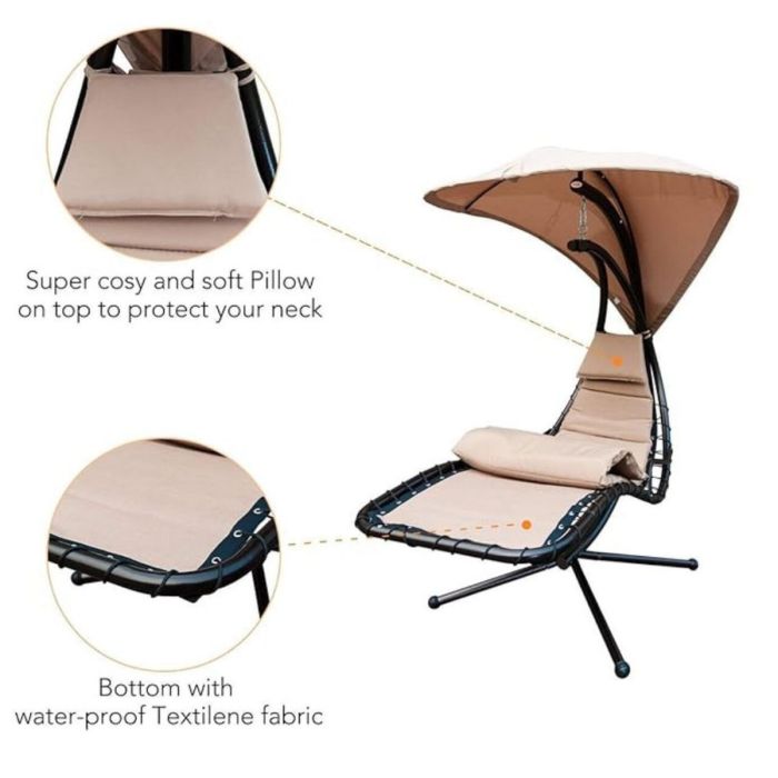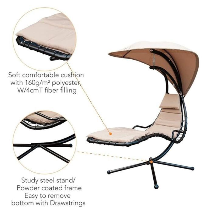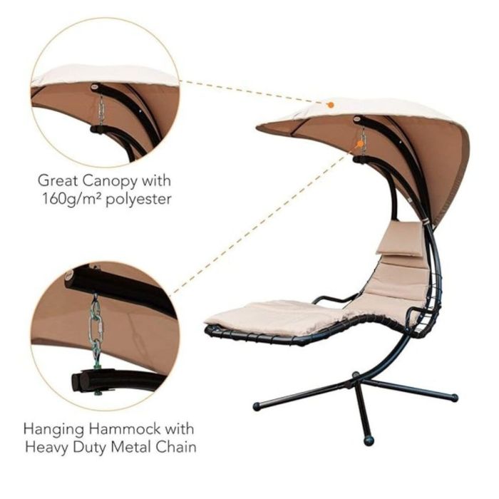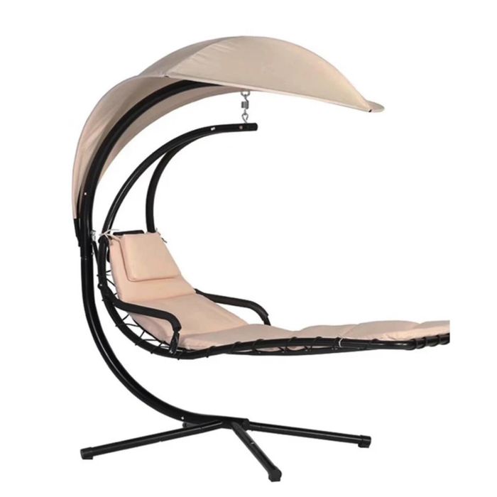 A luxurious hanging chaise lounge chair featuring a sleek curved steel stand and a detachable, adjustable canopy for optimal shade. Designed to create a zero-gravity feel, it offers ergonomic support with thick cushions and a cushioned headrest for peaceful relaxation. Its robust powder-coated steel frame ensures stability and weather resistance. Easy to assemble and ideal for indoor and outdoor spaces, this chair combines modern elegance with functional comfort.