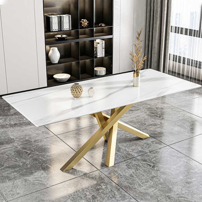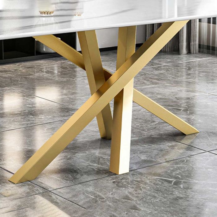 This Table is made of artificial marble top, and a wrought iron base that gives a premium presence and strong stability, a crossed-base design that adds a modern touch, ideal as a dining table or for neat hosting setups, and it complements your decor easily.