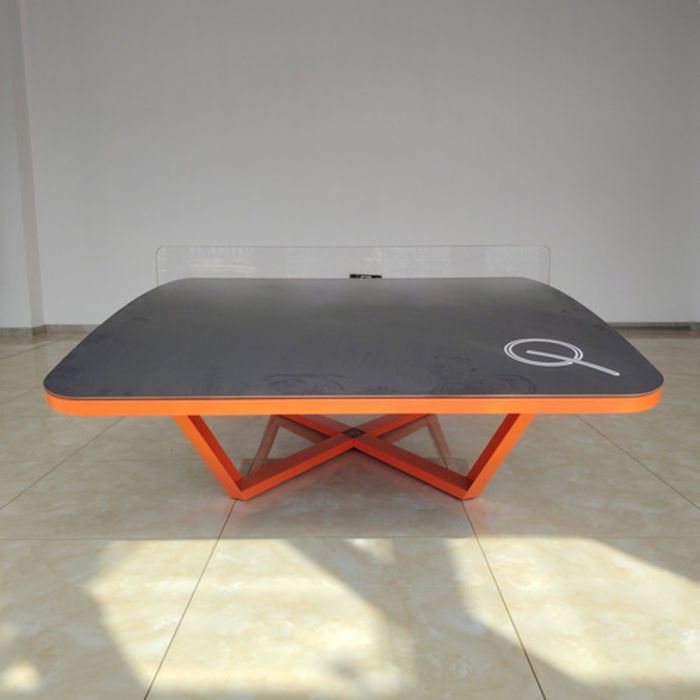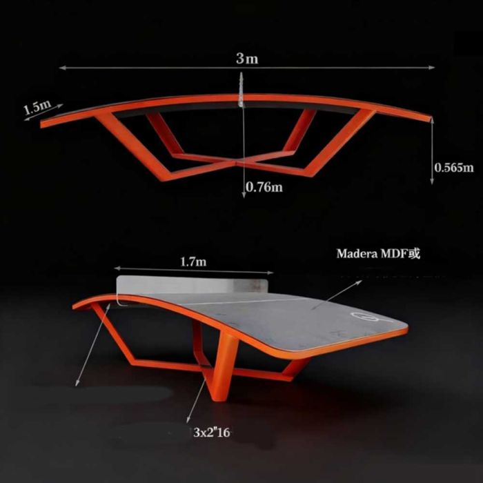This curved outdoor tennis table is crafted with a waterproof HPL surface, offering an innovative playing experience with balanced bounce distribution and a strong metal frame that ensures excellent stability, making it ideal for outdoor spaces and sports activities.