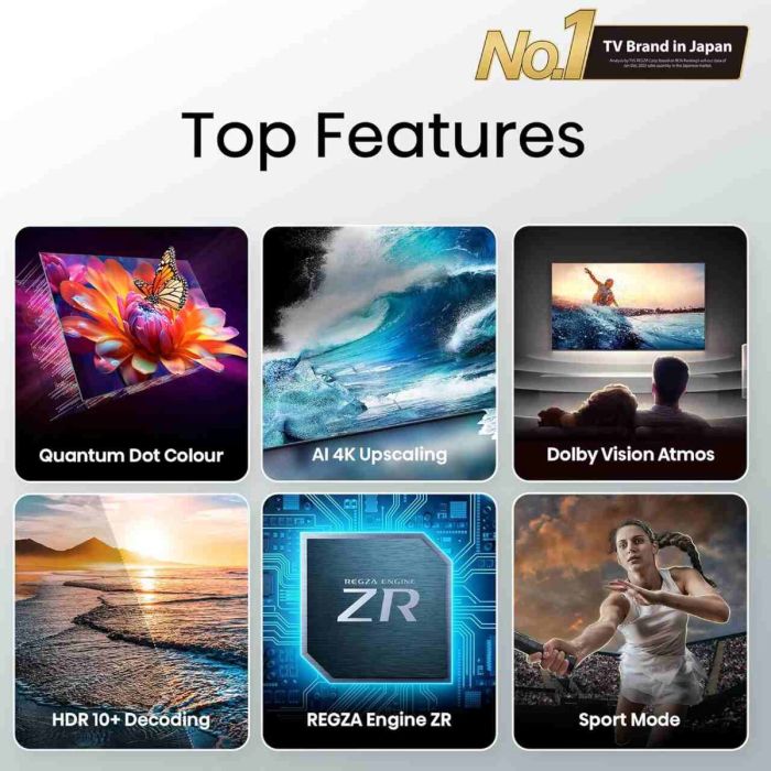- Audio: Dolby Atmos, Dolby Digital, REGZA Power Audio.