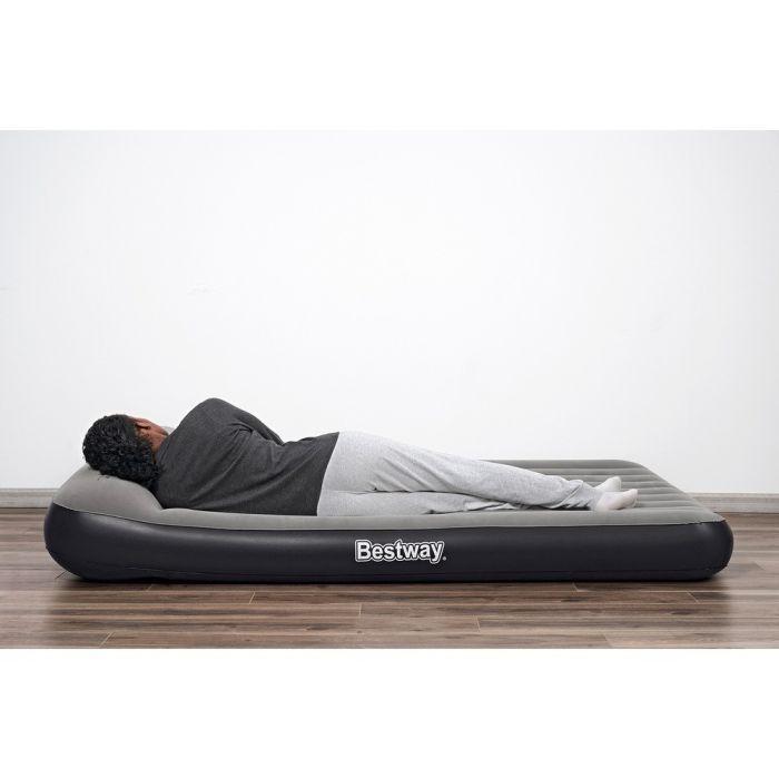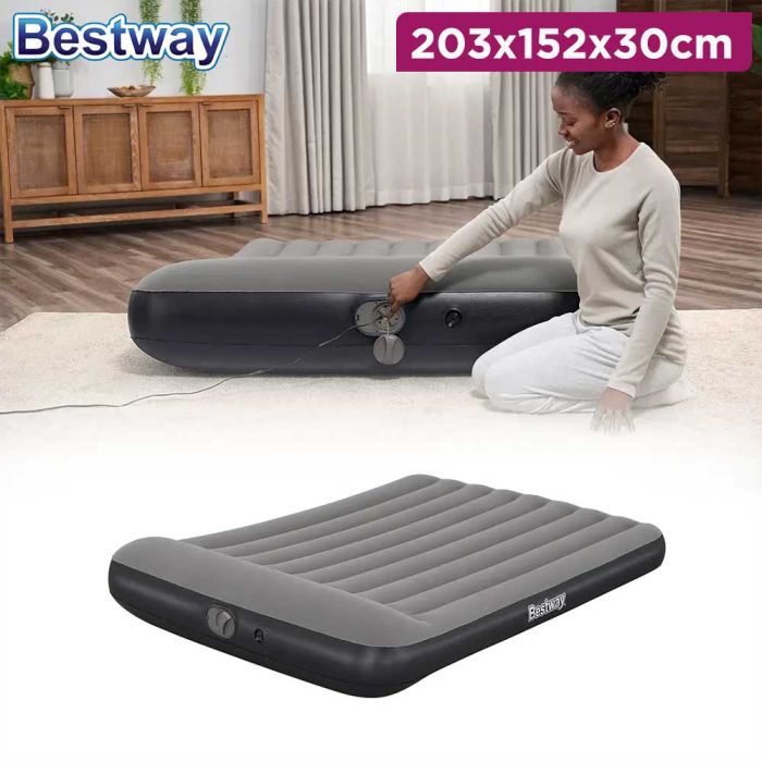 Enjoy a comfortable sleep anywhere with the Bestway Double Air Mattress featuring durable TriTech technology. This mattress offers luxurious comfort thanks to its stable design, soft velvet surface, and built-in pillow that provides optimal head support. It easily inflates in minutes with the built-in USB pump, making it ideal for home, camping, or guests.