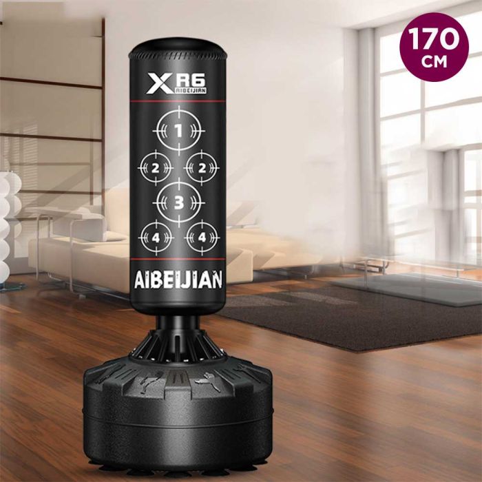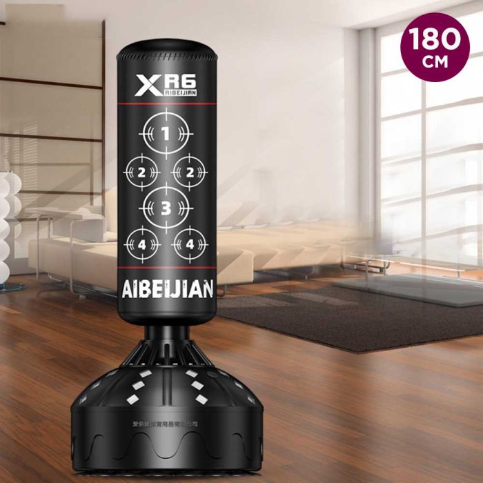 This boxing bag with a 170 or 180 cm base offers enhanced flexibility through its two-speed swing system and 1234 target pattern for accurate striking. It features thick PU leather and high-rebound foam for superior shock absorption, combined with a fillable base and strong suction cups, providing excellent stability for home training sessions.