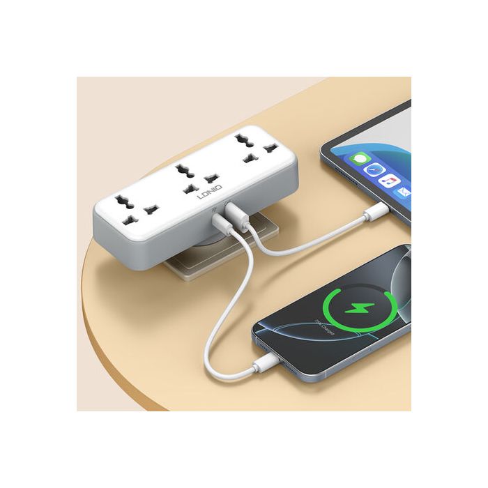 A compact and portable high-power extension device designed to meet modern household and travel charging needs. Featuring a 180° rotatable plug, 3 AC outlets, and 2 USB ports, it allows you to power multiple devices simultaneously. With a 2500W output capacity and support for PD3.0 and QC3.0 fast-charging protocols, it ensures fast, safe, and efficient power delivery for mobile phones, tablets, and large appliances. It also provides full protection against voltage spikes, fluctuations, and electromagnetic interference.