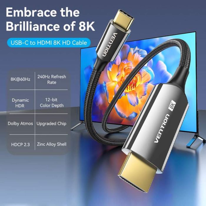 It delivers the highest levels of visual precision by seamlessly transferring stunning 8K content from USB-C devices to cutting-edge displays. Vention utilizes zinc alloy and braided cotton for superior protection and consistent performance while ensuring digital signal stability and interference prevention for an immersive viewing experience and exceptional detail.