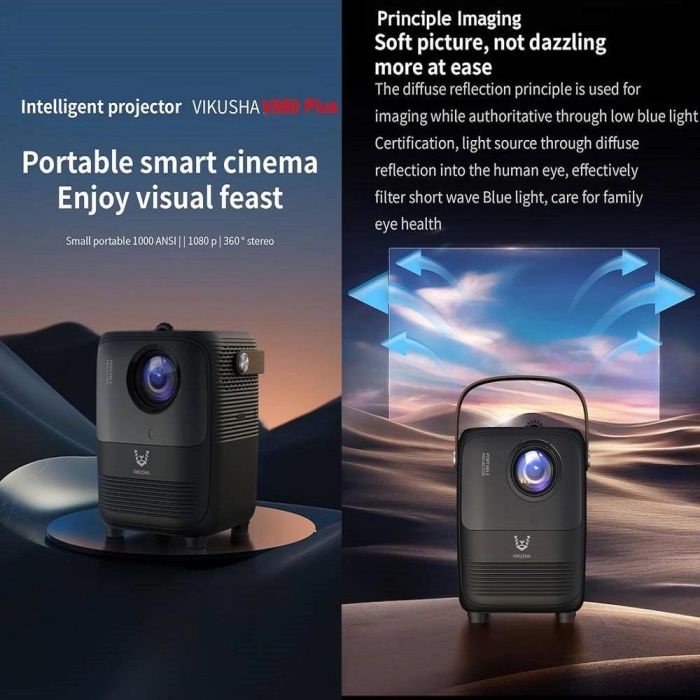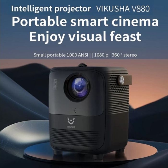 Enjoy a cinematic home experience with the smart VIKUSHA V880 projector. Featuring 1080P resolution and Android OS, it offers dual-band WiFi connectivity and a powerful built-in speaker, with a screen size up to 150 inches