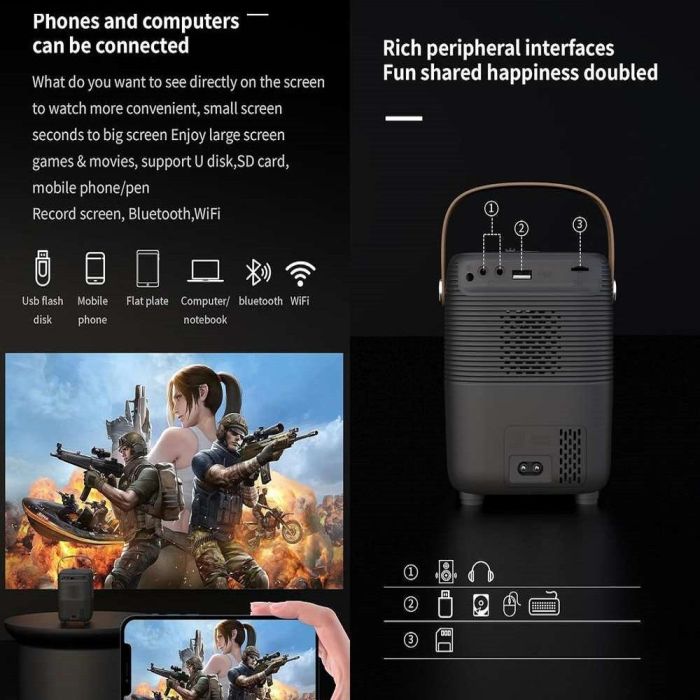 With the smart Android OS, 16GB storage, and 2GB RAM, this projector delivers smooth performance and instant access to your content. It supports direct connection to phones and computers, with versatile ports for easy file sharing, built-in speaker and easy manual focus