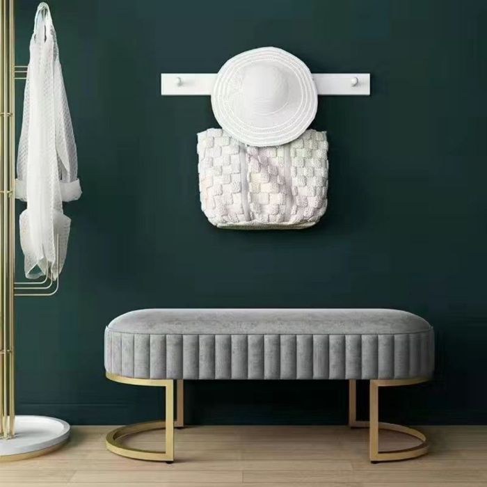 This Velvet entry bench with a metal base made from elegant materials, offering comfortable seating and adding a refined luxurious touch that complements the entryway with a calm modern style