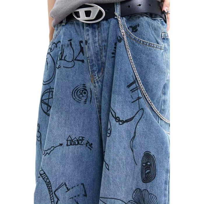 Trendy jeans inspired by American street fashion, with a wide and comfortable design and eye-catching graffiti prints that give you a unique and distinctive youthful look for every casual occasion.Today's Deal is Vintage Graffiti High-Waisted Wide-Leg Jeans