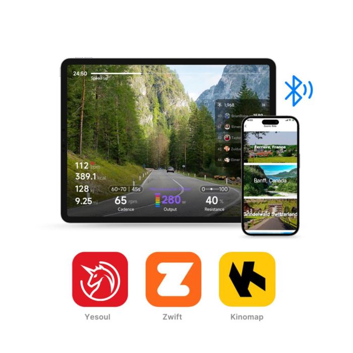 - Connects to fitness apps (like YESOUL FITNESS) via Bluetooth technology, with access to continuously updated courses (including Cardio and Strength), and engaging "Scenic Ride" experiences